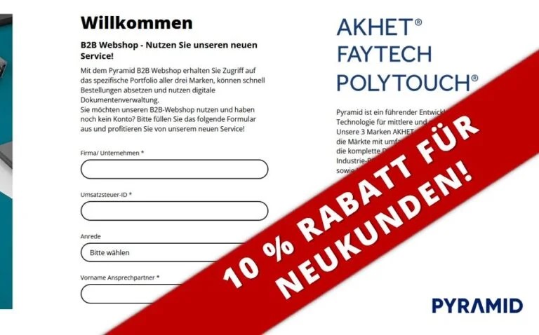 Lanzamos una promoción de descuento exclusiva para nuestros nuevos clientes: Con su primer pedido en el Tienda B2B disfrutar de un Descuento del 10 % sobre toda la cesta de la compra en POLYTOUCH® y AKHET® Productos. Esta es su oportunidad de adquirir nuestras soluciones de alta calidad a un precio reducido.