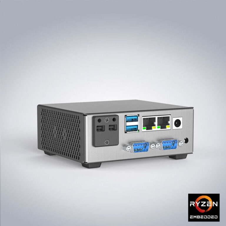 En la parte frontal, el sistema cuenta con 4 puertos USB 2.0 y 4 puertos USB 3.0, 2 Ethernet de 1 GBit, 2 RT Ethernet y, opcionalmente, 4 Ethernet de 1 GBit a través de 1 PCIe.