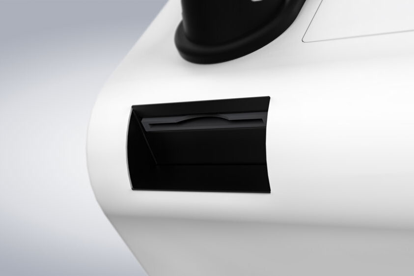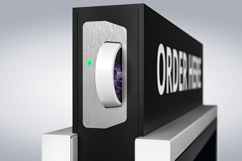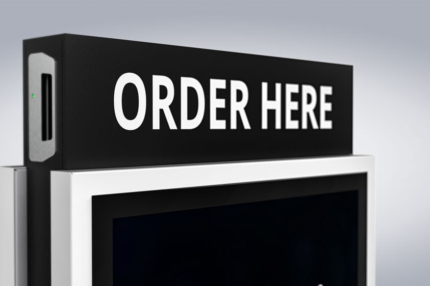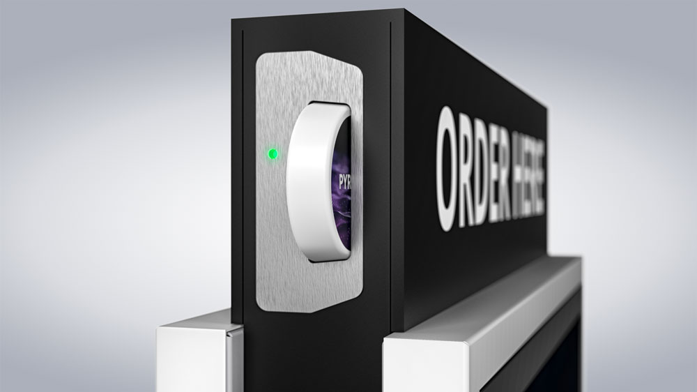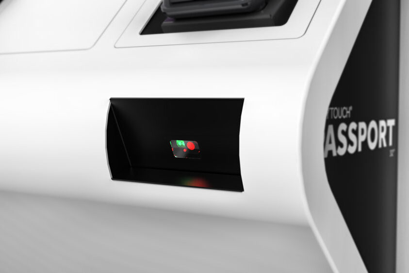 Gracias a su panel frontal, el PASSPORT 32 llama la atención de los clientes PASSPORT 32 en zonas muy concurridas. El panel frontal es opcional y se puede personalizar en cuanto a material, forma y rotulación.